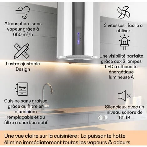 PUISSANTE ET FILTRE TOUTES LES VAPEURS : Avec 3 niveaux de puissance et un débit de 650m³/h, la hotte suspendue réduit les odeurs et filtre les vapeurs pour une meilleure qualité de l’air. Une minuterie éteint la hotte lorsque vous ne l’utilisez pas.