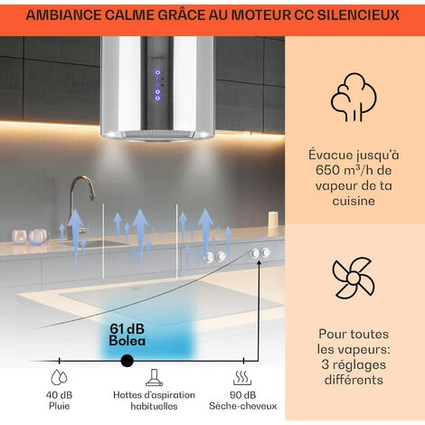 PUISSANTE ET FILTRE TOUTES LES VAPEURS : Avec 3 niveaux de puissance et un débit de 650m³/h, la hotte suspendue réduit les odeurs et filtre les vapeurs pour une meilleure qualité de l’air. Une minuterie éteint la hotte lorsque vous ne l’utilisez pas.
