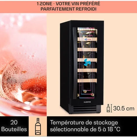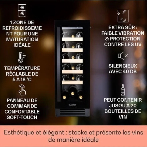 Design élégant et fonctionnement intelligent : La cave à vin encastrable Klarstein Vinovilla 20 est une petite cave pratique qui enrichit chaque espace de vie ou cuisine intégrée avec sa porte vitrée moderne et sa façade en inox – bienvenue chez les pros de la conservation du vin ! Son filtre à charbon actif permet une conservation de longue durée sans odeur et assure aux vins fins une température de consommation optimale.