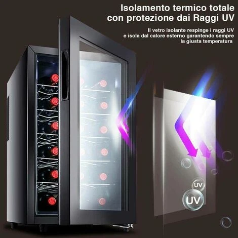 La cave à vin réfrigérée Bakaji est équipée d’un moteur thermoélectrique très puissant de 70 watts qui distribue le froid de façon homogène et constante à l’intérieur de la cave tout en maintenant la bonne température pour le vin stocké.