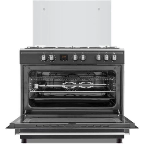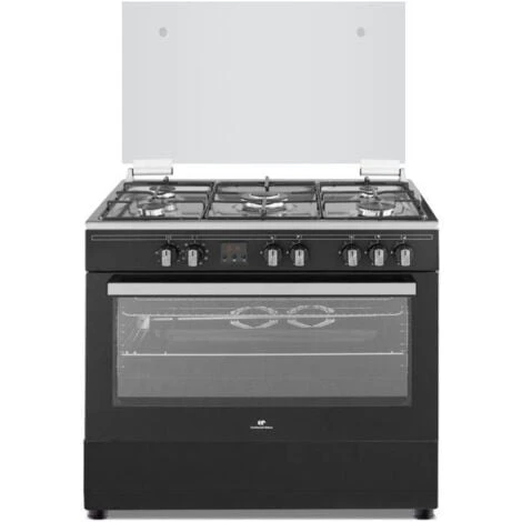Cuisiniere piano, table de cuisson inox, 5 foyers gaz, allumage 1 main, four catalyse 100L, 8 programmes, multifonction, gril, éclairage intérieur, minuteur, affichage digital, porte du four démontable, pieds réglables, NOIR MAT, Garantie 2 ans pieces main d’oeuvre et déplacement