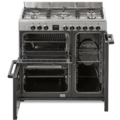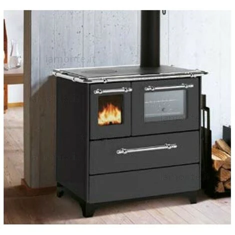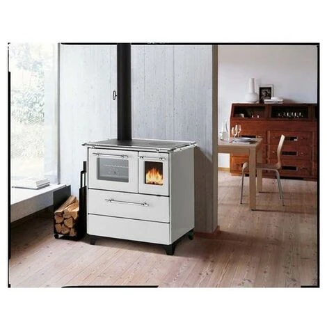 Poêle à bois traditionnel en acier émaillé avec finitions en acier inoxydable. En plus de cuisiner, il chauffe l’environnement par rayonnement. Il se compose d’une plaque de cuisson en acier et d’un four émaillé noir avec une porte en vitrocéramique équipée d’un thermomètre. Dans la partie inférieure se trouve une boîte à gants pratique. Il est conçu pour l’évacuation des fumées supérieure, latérale et arrière.