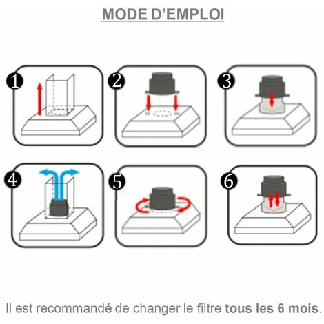 Filtre de hotte universelle au charbon actif. Permet de filtrer les odeurs de cuisson lorsque a hotte fonctionne en mode recyclage. Il remplace les filtres K7 charbon montés à l’intérieur des hottes . Il s’adapte sur tous les types de hottes (décor verre, hottes cheminées , casquettes, groups encastarbles …) sur des sorties 125 et 153 mm. Remplacement en quelques secondes par simple rotation (voir les schéma de montage). Efficace pendant 6 mois
