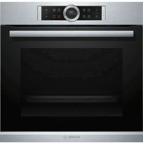 BOSCH – Four multifonction pyrolyse inox 71 l – Classe A+ – Gradins et tôle a pâtisserie pyrolysables – Ecran TFT couleur sensitif 2,5′ avec texte clair – Anneau de contrôle intuitif – Intérieur de porte plein verre – 8 modes de cuisson dont Hotair 4D et décongélation – CookAssist – Porte abattante, systeme SoftMove –