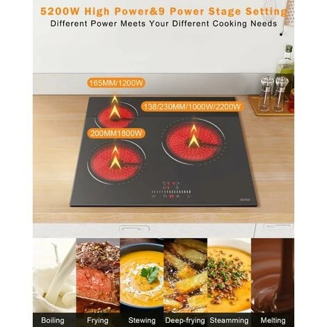 - 【Réglage de la Puissance de 5200 W et 9 Niveaux】 La table de cussion vitrocéramique dispose d’un total de 3 zones de cuisson avec une puissance totale de 5200 W, vous aidant à cuisiner rapidement. Chaque zone de cuisson a 1 à 9 niveaux de réglage de la puissance, Vous pouvez régler la puissance optimale pour la cuisson en fonction des différents besoins de cuisson.