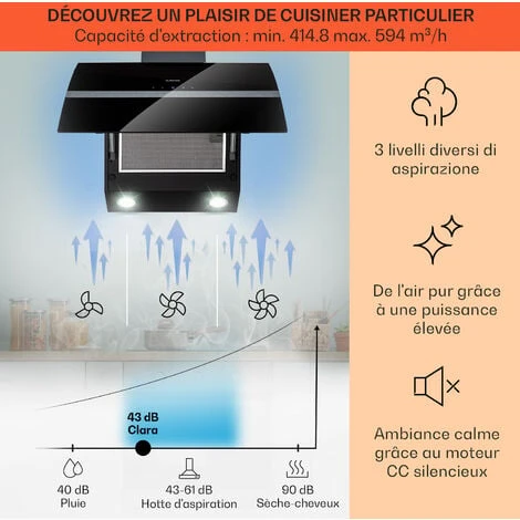 La hotte aspirante Klarstein Clara 90 aspire sans relâche les odeurs et les vapeurs avec un débit d’air extrait de 509 m³/h et assure un climat ambiant agréable pendant toutes vos activités de cuisson. Le design à la fois clair et élégant de la hotte Clara 90 attire les regards au-dessus de votre cuisinière et l’éclairage d’ambiance activable fait briller encore plus la hotte murale. Tous les réglages s’effectuent de manière pratique et claire grâce à la commande tactile. Bien dissimulé derrière sa façade en verre se cache un filtre à graisse en aluminium, résistants au lave-vaisselle, qui protège le conduit d’évacuation d’air et l’intérieur contre la contamination.