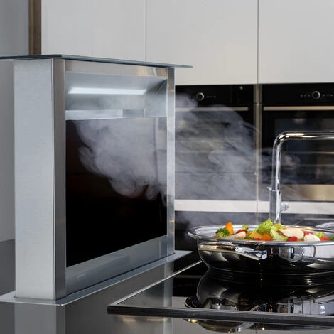 UN HOTTE INGENIEUSE : Aspirant la vapeur horizontalement sur la cuisinière, plutôt que de la laisser monter, ces hottes aspirantes descendantes sont installées sur un plan de travail ou un îlot de cuisine et se lèvent lorsqu’il est temps de cuisiner.