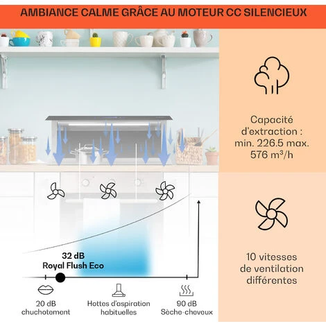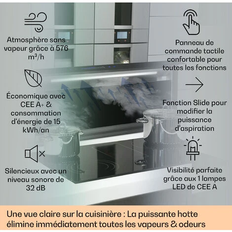 UNE ASPIRATION PUISSANTE ET SILENCIEUSE : Avec un débit d’air puissant de 576 m³/h et 10 vitesses de ventilation, notre hotte aspirante 90cm réduit les odeurs et filtre les fumées pour une meilleure qualité de l’air tout en restant siliencieuse.