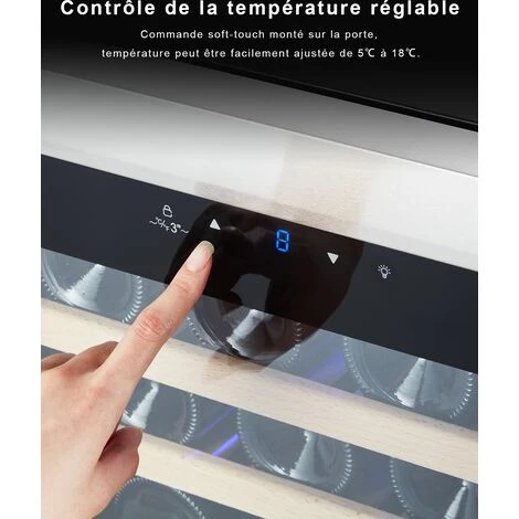 2.Utilisation simple: Un écran tactile avec affichage numérique et une lumière LED, réglez avec précision la température à l’intérieur de la cave a vin vieillissement, température réglabele de 5 à 18 °C. Porte en verre trempé et de la intérieur LED bleue lumineux fait de la cave a vin de service un meuble décoratif dans chaque pièce.