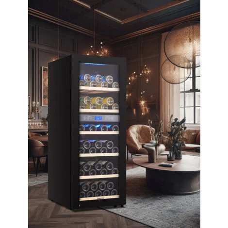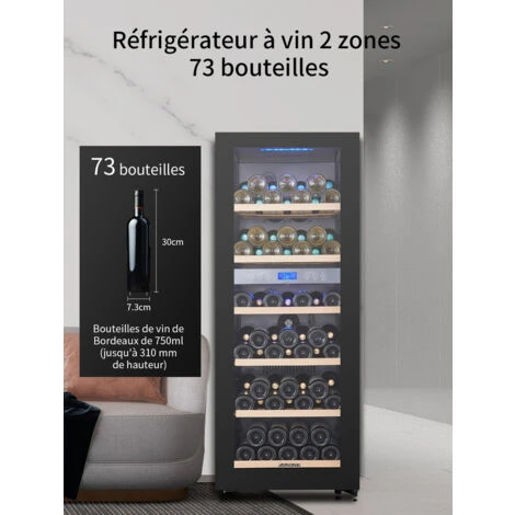 1.Parfait compact: C’est un appareil simple et moderne cave a vin 2 zones, Stockage de jusqu’à 73 bouteilles (pour les bouteilles standard jusqu’à 310 mm de hauteur). Vraiment pratique pour mettre dans le salon ou dans la cuisine ne prend pas de place.