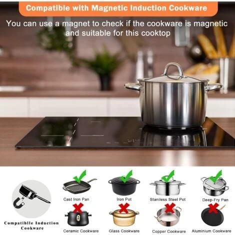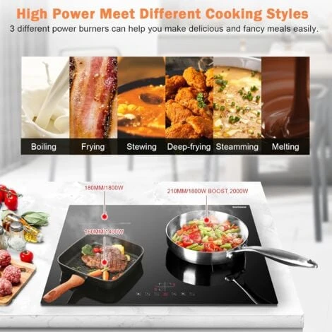 - 【Liste des Colis】 1 * plaque Induction, 1 * manuel, 1 * cordon d’alimentation de 1,2 m sans prise. Remarque : n’utilisez des pot adaptées à plaque Induction, vous des pouvez tester avec aimants, si le fond de la pot peut attirer des aimants, alors cette pot peut être utilisée pour plaque Induction. Et le fond du pot doit rester plat et propre. La taille du fond de la marmite correspondant aux trois brûleurs est de : 14-18 cm en haut à gauche, 12-16 cm en bas à gauche et 16-21 cm en bas à droite.