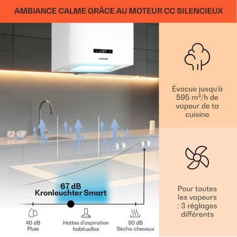 Le nom de la Kornleuchter Smart de Klarstein vous dit tout : la hotte aspirante îlot intelligente au débit d’air maximal de 595 m³ / h garantit un air propre et clair dans la cuisine. Le panneau LED intégré de 6500 Kelvin illumine votre cuisine comme en plein jour. Elle sse contrôle très facilement par l’application Klarstein. Les matériaux de haute qualité et le design cubique se combinent pour attirer véritablement le regard. Avec ses trois vitesses, son faible niveau sonore de 67 dB et sa classe d’efficacité énergétique A, la Klarstein Kronleuchter Smart est tout à fait convaincant.