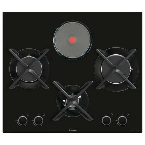 Table de cuisson mixte – Dessus verre trempé – 1 plaque et 3 brûleurs dont 1 rapide 3,1 kW – Allumage intégré aux manettes – Robinets à réglage progressif – Sécurité gaz par thermocouple – Grilles mono-foyer fonte.