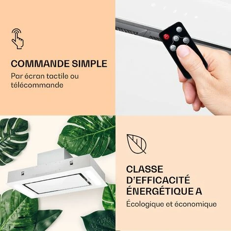Lorsque les odeurs de nourriture font leur apparition dans la cuisine, la hotte aspirante Klarstein Remy très design est là pour vous aider. Son moteur de 230 watts à trois vitesses évacue jusqu’à 619 m³/h d’air et élimine vigoureusement vapeur et fumées pendant la cuisson. Flexible : utilisez-la comme hotte de plafond au-dessus d’un îlot de cuisson ou comme hotte encastrée et sous les placards dans votre cuisine équipée. Commandez-la facilement par l’écran tactile ou confortablement par télécommande et éclairez la surface de cuisson avec un éclairage LED indépendant. Vous pouvez également la convertir en mode de recirculation avec des filtres à charbon actif.