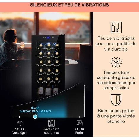 Pour l’amour du vin : la cave à vin Klarstein Shiraz 18 Slim Uno garantit le meilleur plaisir du vin en conservant les bouteilles à la bonne température de consommation. Elle brille par son design fin et s’insère merveilleusement bien dans les petits espaces. Conservez jusqu’à 18 bouteilles de vin de manière optimale à une température de dégustation comprise entre 5 et 18 °C. La porte frontale en verre de sécurité vous permet de présenter les bouteilles de manière magnifique.