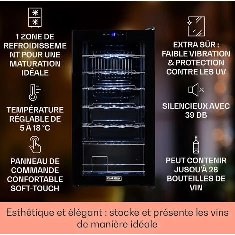 PRÉSENTATION ÉLÉGANTE DES VINS : En plus de sa porte en verre, la cave à vin Klarstein est doté d’un cadre en acier inoxydable brossé, un éclairage intérieur et un espace pour le champagne pour être pratique au quotidien.