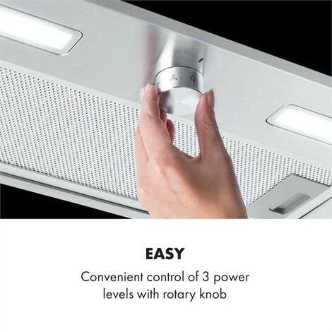 La Klarstein Simplica assure un air sans vapeur dans les petites et grandes cuisines avec son moteur d’extraction de 125 watts. Trois niveaux de puissance extraient jusqu’à 400 m³ d’air par heure et adaptent la hotte intégrée à l’activité de cuisson. La particularité de la Simplica de 52 cm de large est sa capacité à s’intégrer parfaitement dans votre cuisine. Contrairement à la plupart des hottes encastrées, elle disparaît dans le placard de la cuisine au-dessus de la cuisinière et ne laisse voir que son élégante face inférieure en inox brossé. Le bord avant de la Simplica comporte un bouton pratique et élégant pour contrôler la ventilation et l’éclairage. L’éclairage à commande séparée avec 2 lampes LED de 1,5 W assure également une bonne visibilité sur la surface de cuisson en toutes circonstances.
