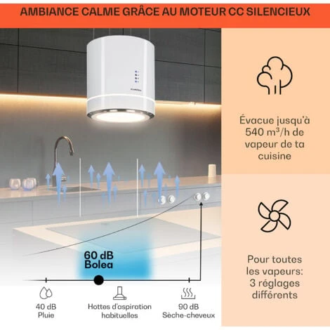 L’aspect de la hotte en îlot Klarstein Tron Ambience est résolument élégant. Avec son design PureAmbience, le corps rond et blanc de l’îlot de cuisson apporte un éclat futuriste avec son anneau lumineux LED.