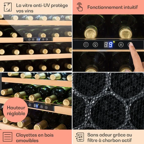 CAPACITÉ DE 24 BOUTEILLES : Rangez jusqu’à 24 bouteilles de vins sur 3 étagères en bois grâce à ce réfrigérateur à vin de 57 litres. La température est contrôlée pour conserver vos vins plus longtemps.